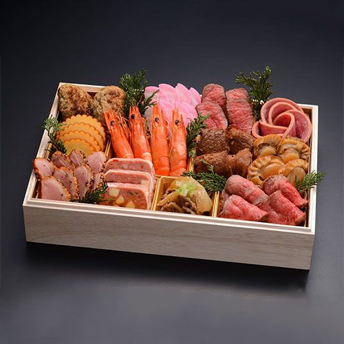 岩手県で育った黒毛和牛「前沢牛」や、千葉県産の「しあわせ絆牛」、「ダイヤモンドポーク」、「匠味豚」等使用した特別な日のための御節。