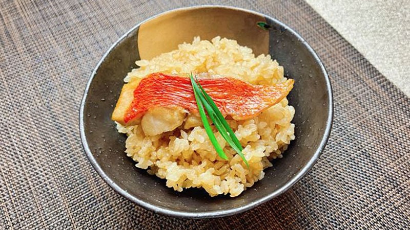 金目鯛を捌いて出たアラを、北海道産の真昆布と一緒に煮てダシをとります。魚から出た油分でお米がコーティングされるのでパサつかず、旨味たっぷりの美味しい炊き込みご飯に仕上がります。切り身にした金目鯛は、一度オーブンで塩焼きにしてからお米と一緒に炊き込んでいますので、ご飯に香ばしさが加わり金目鯛の風味がより一層感じられます。ふっくらとした身をほぐして、ご飯と混ぜ合わせてお召し上がりください。