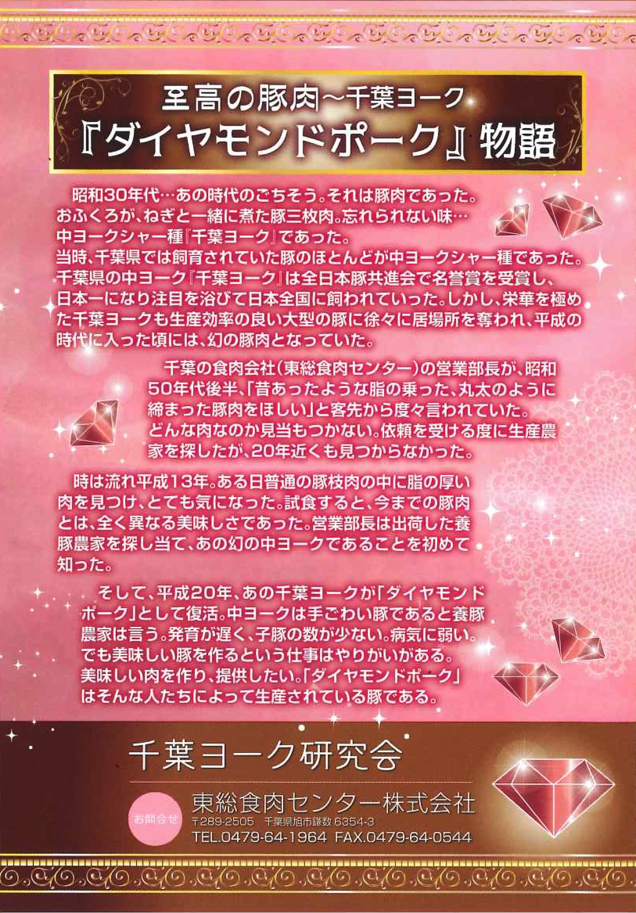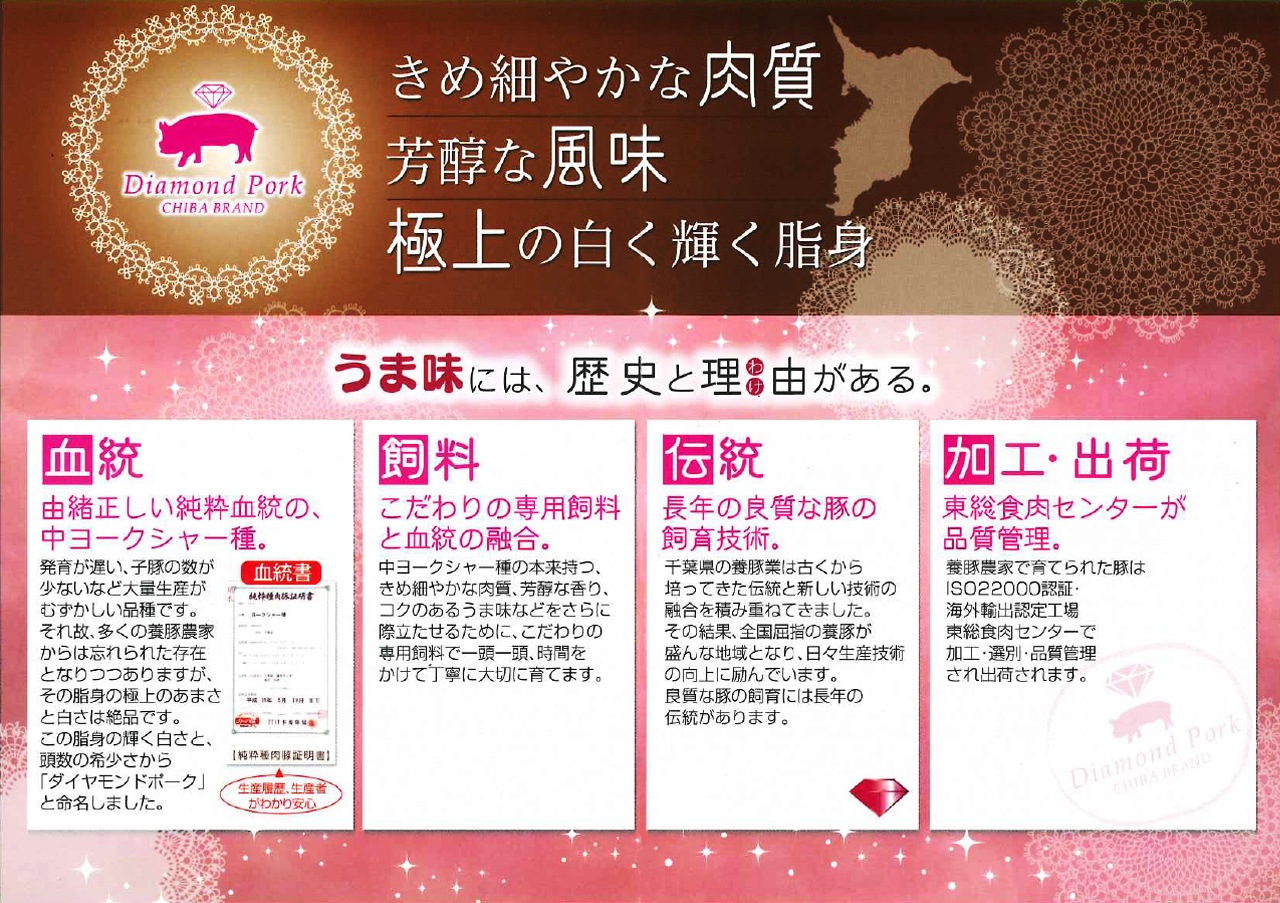 豚肉の中で最も美味しいと称される「中ヨークシャー純粋種」の希少さと、脂部位のピュアホワイトな輝きから「ダイヤモンドポーク」と名付けられた、千葉県屈指のブランド豚肉を取り扱っています。