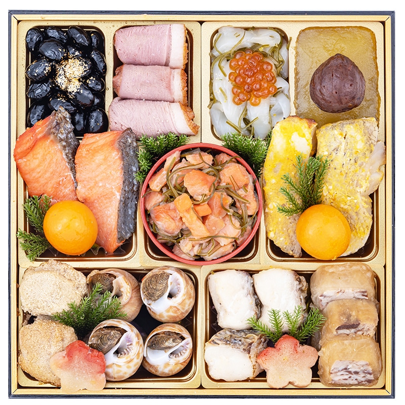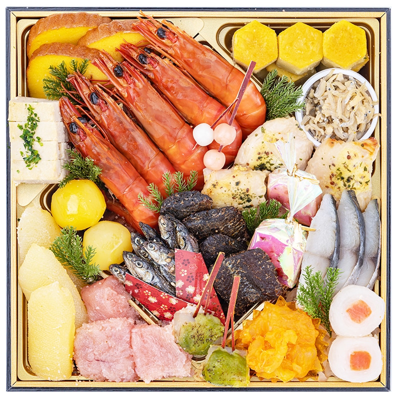 | 原材料 | 海老芝煮(えび(ブラックタイガー)(タイ)、砂糖、その他)、柚子と檸檬のクリームチーズ、伊達巻き、さつまいも金団、高野豆腐含め煮、眞子旨煮(魚卵(真鱈)、しょうゆ、みりん、砂糖、その他)、紫芋テリーヌ、オニオンマリネ、黒豆艶煮金箔、紅鮭昆布松前漬け、さつまいも亀甲焼き、ほたるいか含め煮、椎茸含め煮、赤魚からすみ焼き、若鶏ディアブル風、数の子美味漬け(数の子、しょうゆ、その他)、紅白なます、鰆袱紗焼き、穴子西京焼き、鮭塩麹焼き、合鴨の燻製、ムール貝燻製オイル漬け(※1)、土佐にしん、松前辛子明太子、にしんバジル焼き、トラウトサーモン燻製、真鯛焼浸し、金柑、紅蒲鉾、鰆昆布〆、鶏松風あおさ(鶏肉、出汁入りとろろ(長芋、山芋、その他)、鶏卵、味噌加工品(米味噌、砂糖)、その他)、松前漬け(人参、砂糖、昆布、しょうゆ、その他)、海老雲丹和え、菜の花湯葉巻き、シュリンプペッパーチーズ、烏賊昆布〆、ぶり大根、いちごミルク オーロラ包み(砂糖、加糖練乳、いちご、クリームチーズ、ライスペーパー、その他)、栗甘露、あわび旨煮、紅白砧巻き(大根、紅鮭、砂糖、醸造酢、食塩)、帆立若草焼き串、ばい貝旨煮、白蒲鉾、ちりめん有馬煮(※2)、渋皮栗甘露煮、梅麩、ごまめ(※3)、スタフドオリーブ、人参含め煮、紅白かんざし(還元水あめ、砂糖、その他)、紅白餅玉串(もち米粉、白あん、砂糖、還元水あめ、とうもろこしでん粉)、いくら醤油漬/ソルビトール、調味料(アミノ酸等)、糊料(加工デンプン、増粘多糖類、アルギン酸Na)、加工デンプン、酒精、pH調整剤、甘味料(ソルビトール、カンゾウ、ステビア)、グリシン、乳化剤、着色料(モナスカス、クチナシ、カロチノイド、カルミン酸、金箔、ウコン)、トレハロース、酢酸Na、酸味料、酸化防止剤(ビタミンC)、凝固剤、ポリリン酸Na、重曹、塩化Ca、香料、保存料(しらこ)、ナイアシン、乳酸Ca、卵白リゾチーム、香辛料抽出物、発色剤(亜硝酸Na)、漂白剤(亜硫酸塩)、ビタミンB2、酵素、(一部にえび・小麦・卵・乳成分・あわび・いか・いくら・ごま・さけ・さば・大豆・鶏肉・やまいも・りんご・ゼラチンを含む) ※1 ムール貝に足糸(貝が固着する為の海藻に似た糸)が付着していることがありますが、食しても人体への影響はありません。製品には万全を期しておりますが、稀にムール貝の貝殻が混入する場合があります。口元に気を付けてお召し上がりください。 ※2 いわしの稚魚は、エビ・カニ・イカ・海生プランクトン等が混獲される漁法で採取しています。 ※3 カタクチイワシは、エビ・カニ・イカ・海生プランクトン等が混獲される漁法で採取しています。 本製品には「はちみつ」を使用しております。1歳未満の乳児には与えないでください。 |